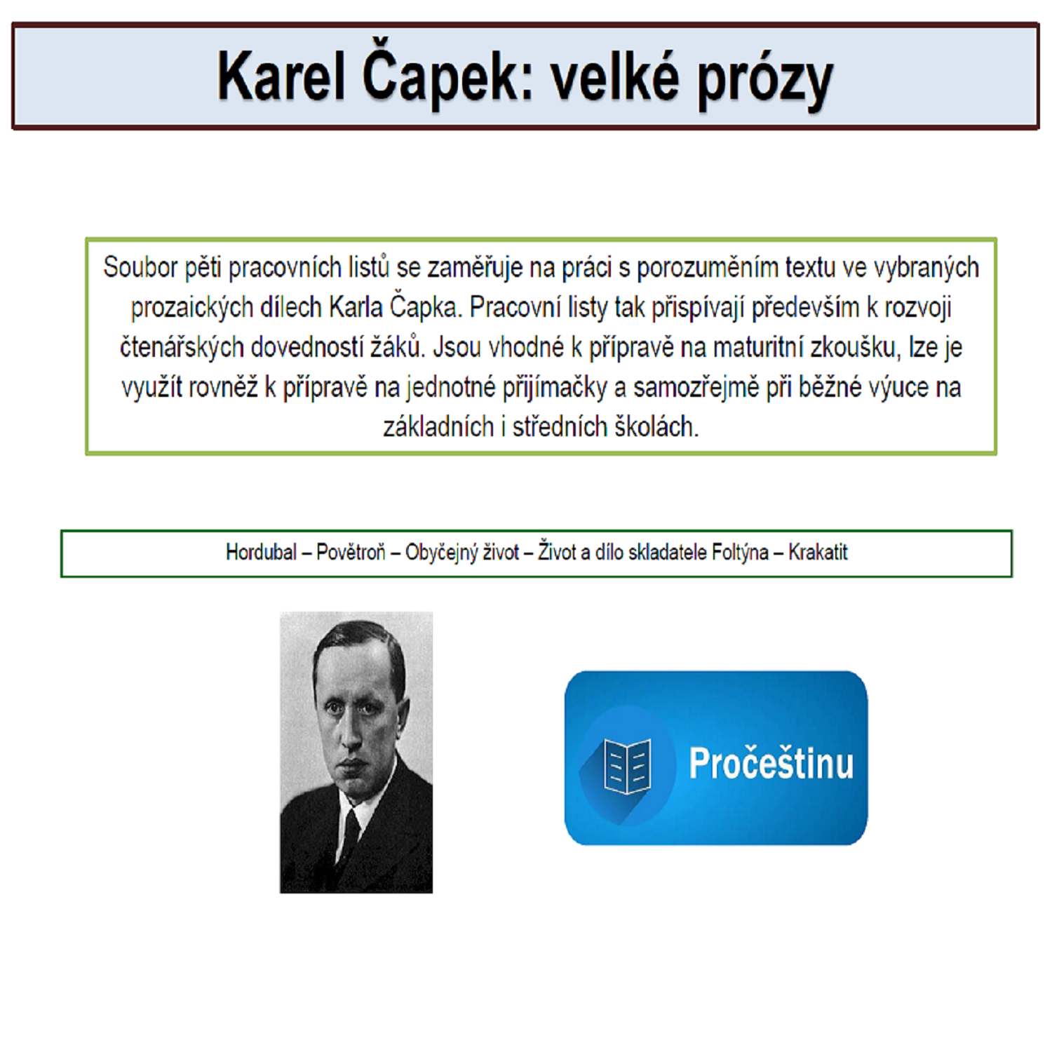 pět pracovních listů s ukázkami z velkých próz Karla Čapka