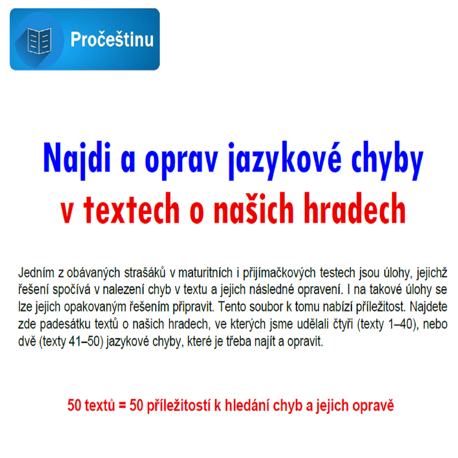 soubor padesáti textů, ve kterých je třeba najít a opravit dvě/čtyři chyby