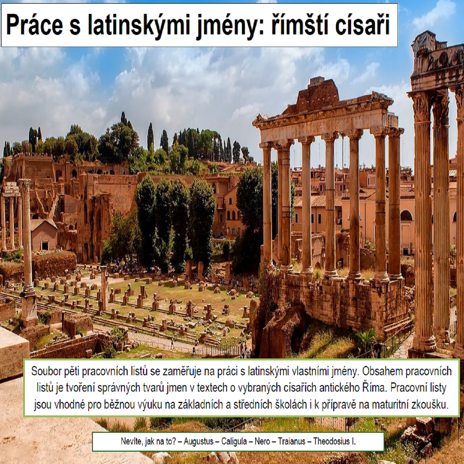 soubor pěti pracovních listů, jejichž obsahem je tvoření správných tvarů jmen v textech o vybraných císařích antického Říma